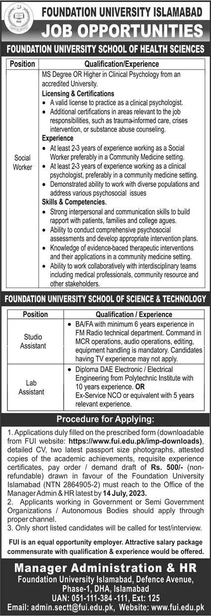 - Interested applicants may send their application to the Manager Admin & HR, Foundation University Islamabad, Defence Avenue, Phase-1, DHA, Islamabad.