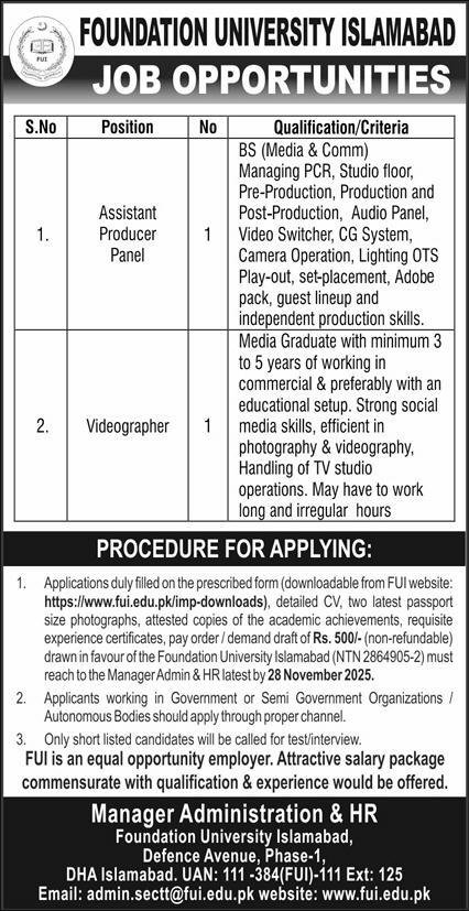 Foundation University Islamabad Jobs 2025 announce the Contract career opportunities for the post of See Below Ad in Federal, Islamabad for the fresh and experienced candidates on Contract basis who have Check Advertisement degree. Posted date of this post is 16/11/2025 and the last date is 28/11/2025. if you are eligible for this job apply before due date.