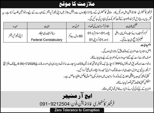 Frontier Constabulary FC Foundation Peshawar Jobs 2026 announce the Contract career opportunities for the post of See Below Ad in Khyber Pakhtunkhwa, Peshawar for the fresh and experienced candidates on Contract basis who have Check Advertisement degree. Posted date of this post is 17/02/2026 and the last date is 03/03/2026. if you are eligible for this job apply before due date.