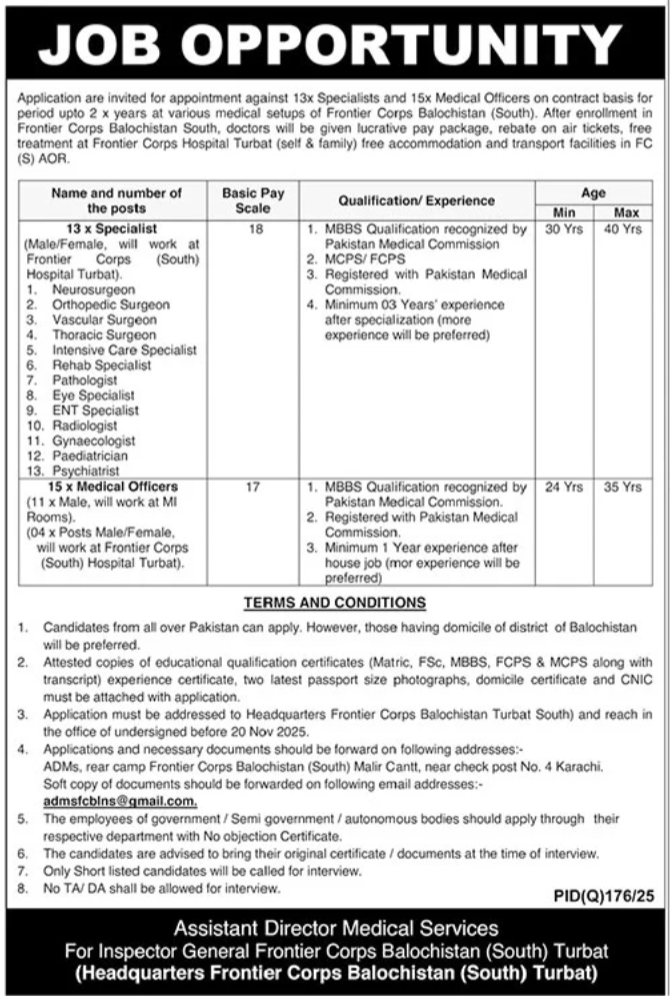 Frontier Core FC Hospital South Turbat Jobs 2025 announce the Contract career opportunities for the post of See Below Ad in Balochistan, Turbat for the fresh and experienced candidates on Contract basis who have Check Advertisement degree. Posted date of this post is 17/10/2025 and the last date is 20/10/2025. if you are eligible for this job apply before due date.