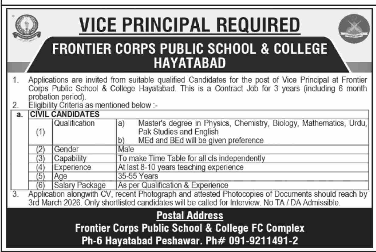 Frontier Corps Public School & College Hayatabad Jobs 2026 announce the Contract career opportunities for the post of See Below Ad in Khyber Pakhtunkhwa, Peshawar for the fresh and experienced candidates on Contract basis who have Check Advertisement degree. Posted date of this post is 25/02/2026 and the last date is 03/03/2026. if you are eligible for this job apply before due date.