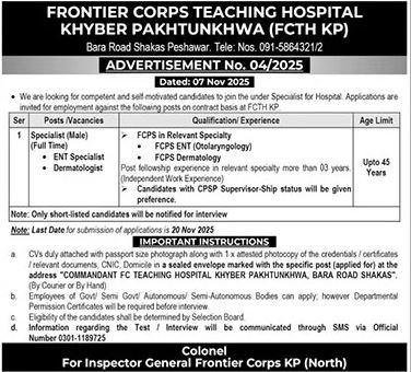Frontier Corps Teaching Hospital FCTH Peshawar Jobs 2025 announce the Contract career opportunities for the post of See Below Ad in Khyber Pakhtunkhwa, Peshawar for the fresh and experienced candidates on Contract basis who have Check Advertisement degree. Posted date of this post is 14/11/2025 and the last date is 20/11/2025. if you are eligible for this job apply before due date.