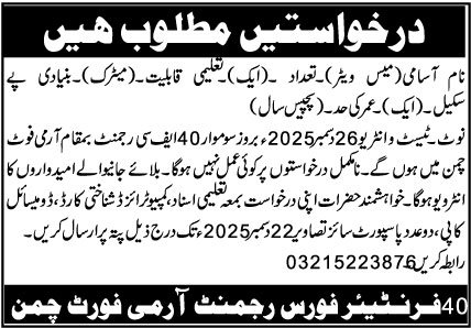 Note: Test and interview will be held on December 26, 2025, Monday, at 40 FC Regiment at Army Fort Chaman. Incomplete applications will not be processed. Only called candidates will be interviewed. Interested individuals should send their application along with educational documents, computerized ID card, domicile copy, two passport size photographs by December 22, 2025, to the following address. Contact: 03215223876