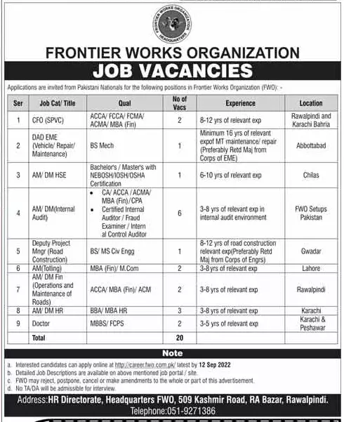 Candidates looking for FWo Jobs 2022, should possess professional qualifications like CA, ACCA, ACMA, FCMA, FCCA, MBA ( finance) and MBA ( HR), MBBS, Master / Bachelor with NEBOSH / OSHA certification, BS / MS Civil Engineering. M.Com and BBA. Relevant experience of 3-12 years in the same discipline is also required. The positions are open at different locations in Frontier Works organization. Read the all details and instructions in the FWO Jobs advertisement posted below.