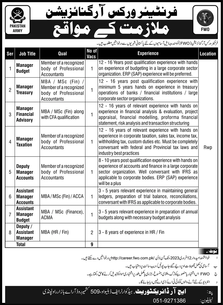 Frontier Works Organization FWO Jobs 2023 announce the Contract career opportunities for the post of See Below Ad in Punjab, Rawalpindi for the fresh and experienced candidates on Contract basis who have Check Advertisement degree. Posted date of this post is 29/01/2023 and the last date is 12/02/2023. if you are eligible for this job apply before due date.