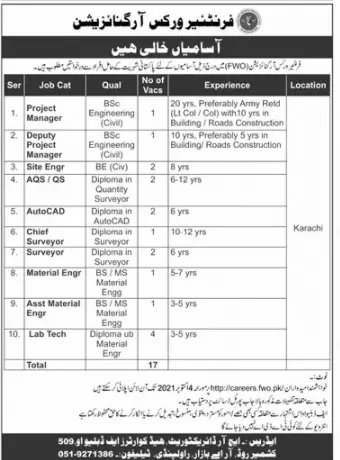 Frontier Works Organization FWO Jobs announce the Permanent career opportunities for the post of See Below Ad in Federal for the fresh and experienced candidates on Permanent basis who have Check Advertisement degree. Posted date of this post is 20/09/2021 and the last date is 04/10/2021. if you are eligible for this job apply before due date.
