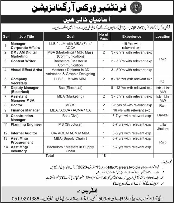 - Frontier Works Organization FWO Jobs are announced recently by the board to hire the services of a Manager of Corporate Affairs, DM/AM Digital Marketing, Content Writer, Visual Effect Artist, Company Secretary, Deputy Manager – Electrical, Assistant Manager MSA, Doctor, Finance Manager, Construction Manager, Planning Engineer, Internal Auditor, Assistant Manager Procurement, and Assistant Manager Inventory.