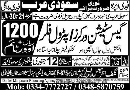 Gas Station Worker & Petrol Filler Jobs 2026 In Saudi Arabia announce the Contract career opportunities for the post of See Below Ad in Saudi Arabia for the fresh and experienced candidates on Contract basis who have Check Advertisement degree. Posted date of this post is 06/01/2026 and the last date is 12/01/2026. if you are eligible for this job apply before due date.