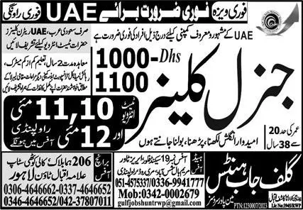 General Cleaner Jobs Open In UAE 2023 announce the Contract career opportunities for the post of See Below Ad in United Arab Emirates for the fresh and experienced candidates on Contract basis who have Check Advertisement degree. Posted date of this post is 10/05/2023 and the last date is 12/05/2023. if you are eligible for this job apply before due date.