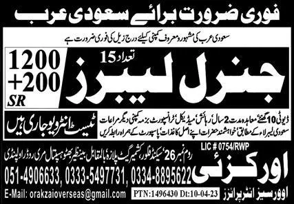 General Labor & Labor Jobs 2023 in Saudi Arabia announce the Contract career opportunities for the post of See Below Ad in Saudi Arabia for the fresh and experienced candidates on Contract basis who have Check Advertisement degree. Posted date of this post is 12/04/2023 and the last date is 19/04/2023. if you are eligible for this job apply before due date.