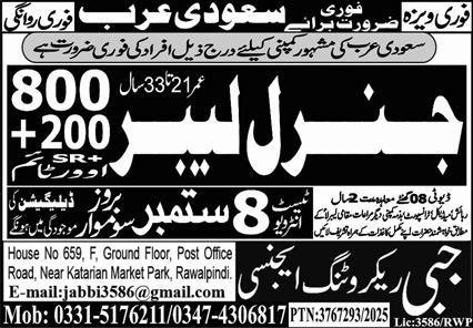 General Labours Jobs in Saudia Arabia 2025 announce the Contract career opportunities for the post of See Below Ad in Saudi Arabia for the fresh and experienced candidates on Contract basis who have Check Advertisement degree. Posted date of this post is 04/09/2025 and the last date is 08/09/2025. if you are eligible for this job apply before due date.
