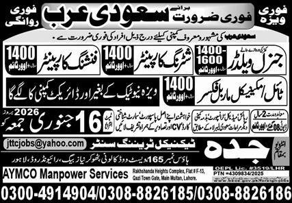 General Welder And Shuttring Carpanter Jobs in Saudia Arabia announce the Contract career opportunities for the post of See Below Ad in Saudi Arabia for the fresh and experienced candidates on Contract basis who have Check Advertisement degree. Posted date of this post is 09/01/2026 and the last date is 16/01/2026. if you are eligible for this job apply before due date.