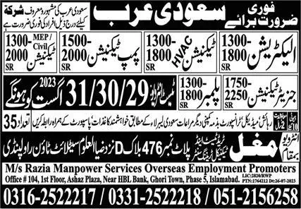 Generator Technician & HVAC Technician Jobs in Riyadh 2023 announce the Contract career opportunities for the post of See Below Ad in Saudi Arabia for the fresh and experienced candidates on Contract basis who have Check Advertisement degree. Posted date of this post is 26/08/2023 and the last date is 31/08/2023. if you are eligible for this job apply before due date.