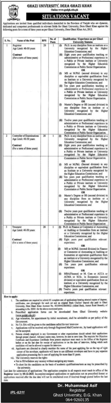 Applications are invited from qualified, dynamic and energetic candidates for the posts of Registrar, Controller of Examinations and Treasurer who are dynamic, qualified and energetic for a tenure of three years on pay scale as per Ghazi University, D.G. Khan Act, 2012.