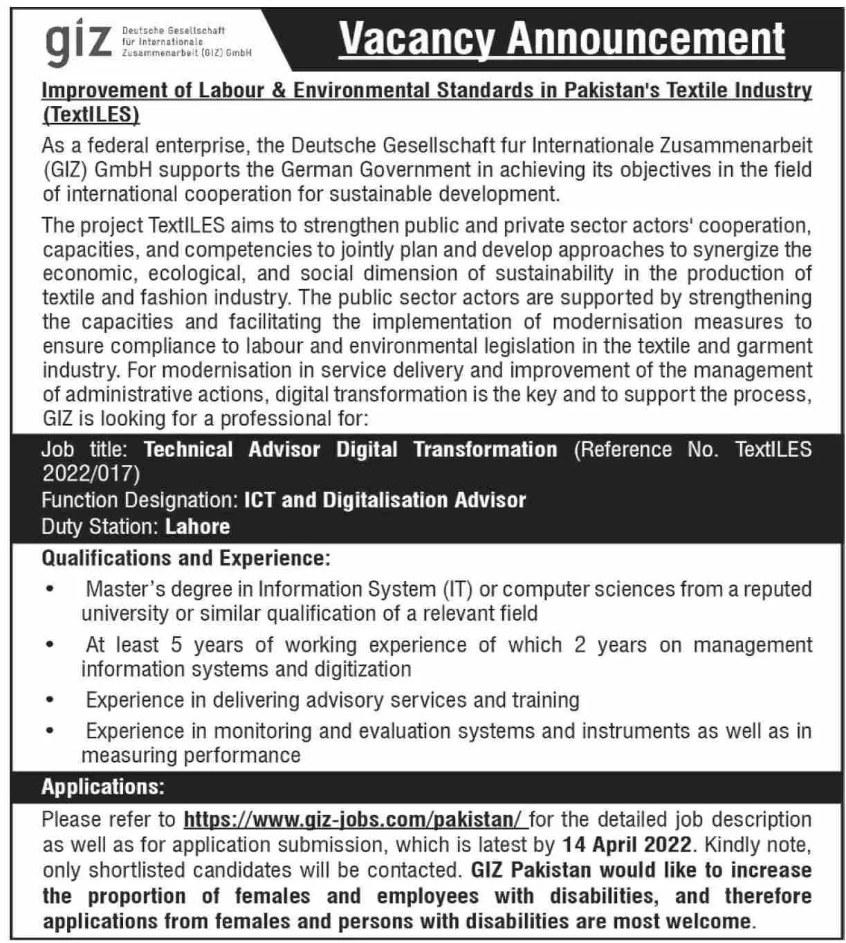 GIZ NGO Islamabad Pakistan Jobs announce the Contract career opportunities for the post of See Below Ad in Punjab,Lahore for the fresh and experienced candidates on Contract basis who have Check Advertisement degree. Posted date of this post is 01/04/2022 and the last date is 14/04/2022. if you are eligible for this job apply before due date.