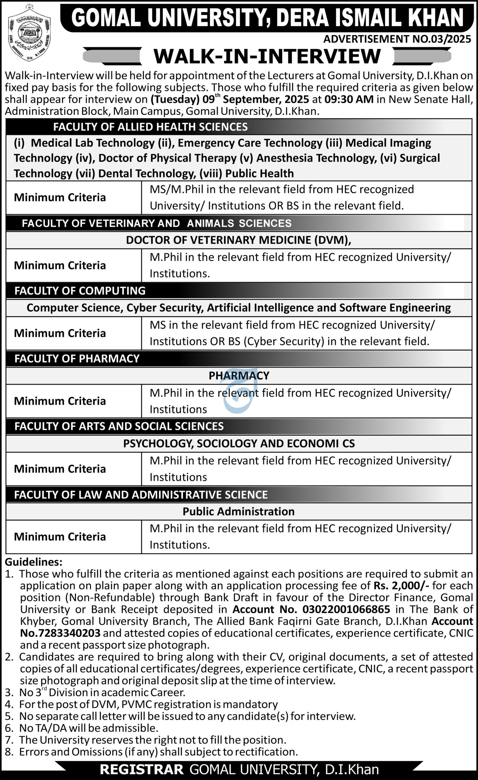 Walk-in-Interview will be held for appointment of the Lecturers at Gomal University, D.I.Khan on fixed pay basis for the following subjects. Those who fulfill the required criteria as given below shall appear for interview on (Tuesday) 09th September, 2025 at 09:30 AM in New Senate Hall, Administration Block, Main Campus, Gomal University, D.I.Khan.