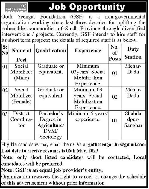 Goth Seengar Foundation GSF Jobs 2023 announce the Contract career opportunities for the post of See Below Ad in Sindh, Karachi for the fresh and experienced candidates on Contract basis who have Check Advertisement degree. Posted date of this post is 03/05/2023 and the last date is 06/05/2023. if you are eligible for this job apply before due date.