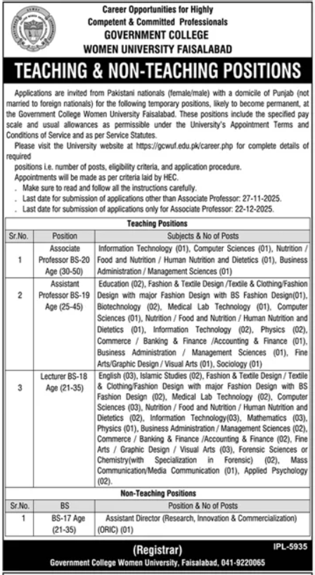Government College Women University Faisalabad GCWUF Jobs announce the Contract career opportunities for the post of See Below Ad in Punjab, Faisalabad for the fresh and experienced candidates on Contract basis who have Check Advertisement degree. Posted date of this post is 05/11/2025 and the last date is 20/11/2025. if you are eligible for this job apply before due date.