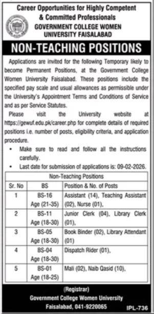 Please visit the University website at https://gcwuf.edu.pk/career.php for complete details of required positions i.e. number of posts, eligibility criteria, and application procedure.