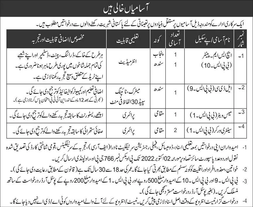 - Candidates should submit their applications along with educational certificates, Domicile Family Registration Certificate Nadir (FRI), Experience Certificates, National Identity Card attested. Send photocopy and two passport size photographs dated 02 October 2022 to PO Bus No. 766.EPO Rawalpindi.