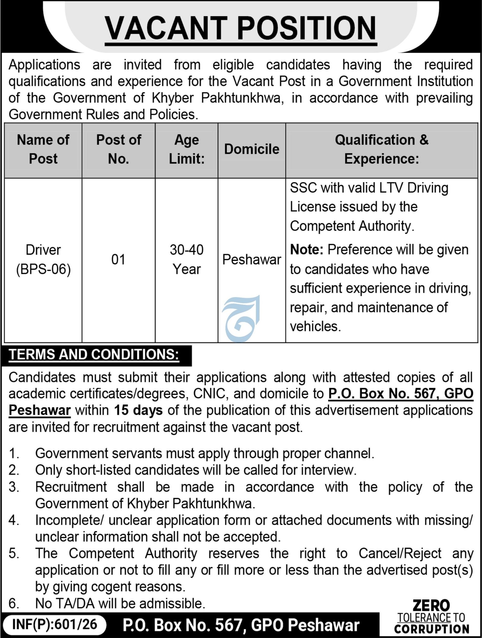 Government Organization Peshawar Job 2026 announce the Contract career opportunities for the post of See Below Ad in Khyber Pakhtunkhwa, Peshawar for the fresh and experienced candidates on Contract basis who have Check Advertisement degree. Posted date of this post is 13/02/2026 and the last date is 28/02/2026. if you are eligible for this job apply before due date.