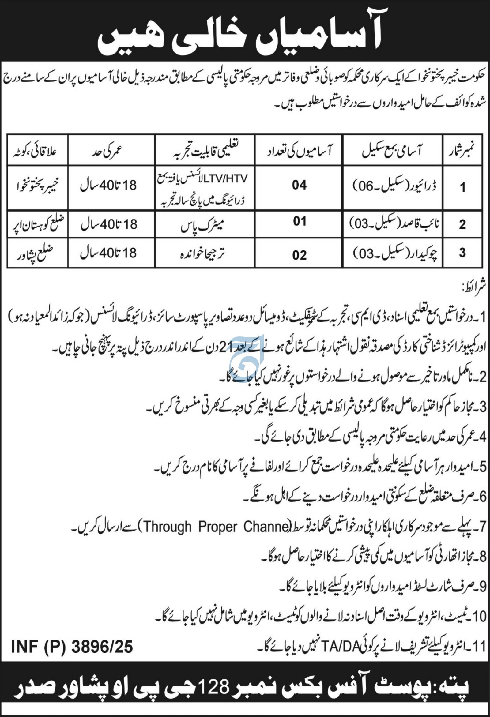 The Government of Khyber Pakhtunkhwa, a government department, invites applications from eligible candidates for the following vacant positions in provincial and district offices, as per prevailing government policy, with the details mentioned below: