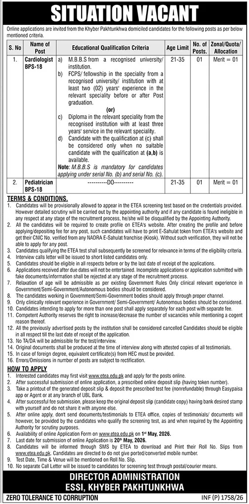 Online applications are invited from candidates domiciled in Khyber Pakhtunkhwa for the following posts based on the criteria below: