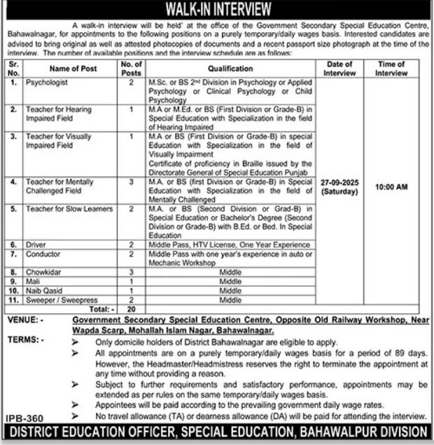 Government Special Education Centre Bahawalnagar Jobs announce the Contract career opportunities for the post of See Below Ad in Punjab, Bahawalnagar for the fresh and experienced candidates on Contract basis who have Check Advertisement degree. Posted date of this post is 11/09/2025 and the last date is 26/09/2025. if you are eligible for this job apply before due date.