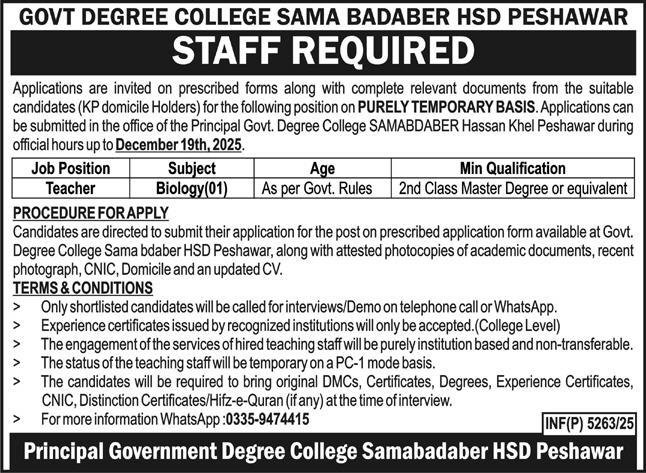 Applications are invited on prescribed forms along with complete relevant documents from the suitable candidates (KP domicile Holders) for the following position on PURELY TEMPORARY BASIS. Applications can be submitted in the office of the Principal Govt. Degree College SAMABDABER Hassan Khel Peshawar during official hours up to December 19th, 2025.