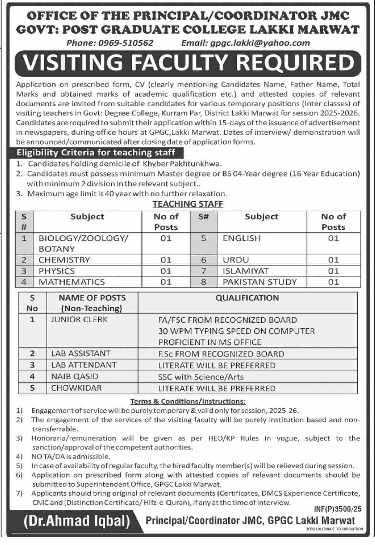 Application on prescribed form, CV (clearly mentioning Candidates Name, Father Name, Total Marks and obtained marks of academic qualification etc.) and attested copies of relevant documents are invited from suitable candidates for various temporary positions (Inter classes) of visiting teachers in Govt: Degree College, Kurram Par, District Lakki Marwat for session 2025-2026. Candidates are required to submit their application within 15-days of the issuance of advertisement in newspapers, during office hours at GPGC, Lakki Marwat. Dates of interview/demonstration will be announced/communicated after closing date of application forms.