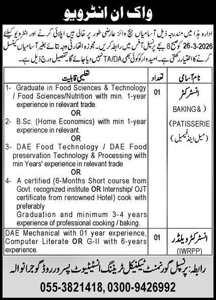 Govt Technical Training Institute GTTI Gujranwala Jobs 2026 announce the Contract career opportunities for the post of See Below Ad in Punjab, Gujranwala for the fresh and experienced candidates on Contract basis who have Check Advertisement degree. Posted date of this post is 25/03/2026 and the last date is 26/03/2026. if you are eligible for this job apply before due date.