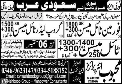 Group Leader Tile Mason & Tile Mason Jobs 2023 Saudi Arabia announce the Contract career opportunities for the post of See Below Ad in Saudi Arabia for the fresh and experienced candidates on Contract basis who have Check Advertisement degree. Posted date of this post is 05/09/2023 and the last date is 06/09/2023. if you are eligible for this job apply before due date.