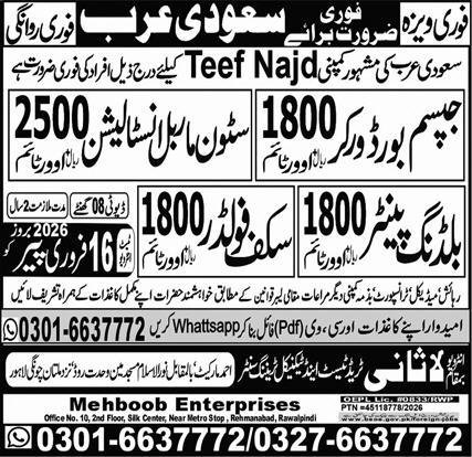 Gypsum Board Worker & Stone Marble Installation Jobs 2026 announce the Contract career opportunities for the post of See Below Ad in Saudi Arabia for the fresh and experienced candidates on Contract basis who have Check Advertisement degree. Posted date of this post is 14/02/2026 and the last date is 16/02/2026. if you are eligible for this job apply before due date.