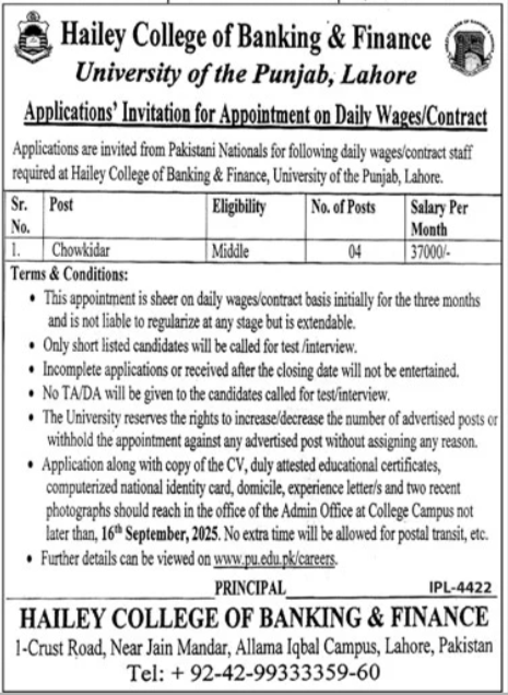 Hailey College Of Banking & Finance Lahore Job 2025 announce the Contract career opportunities for the post of See Below Ad in Punjab, Lahore for the fresh and experienced candidates on Contract basis who have Check Advertisement degree. Posted date of this post is 03/09/2025 and the last date is 16/09/2025. if you are eligible for this job apply before due date.