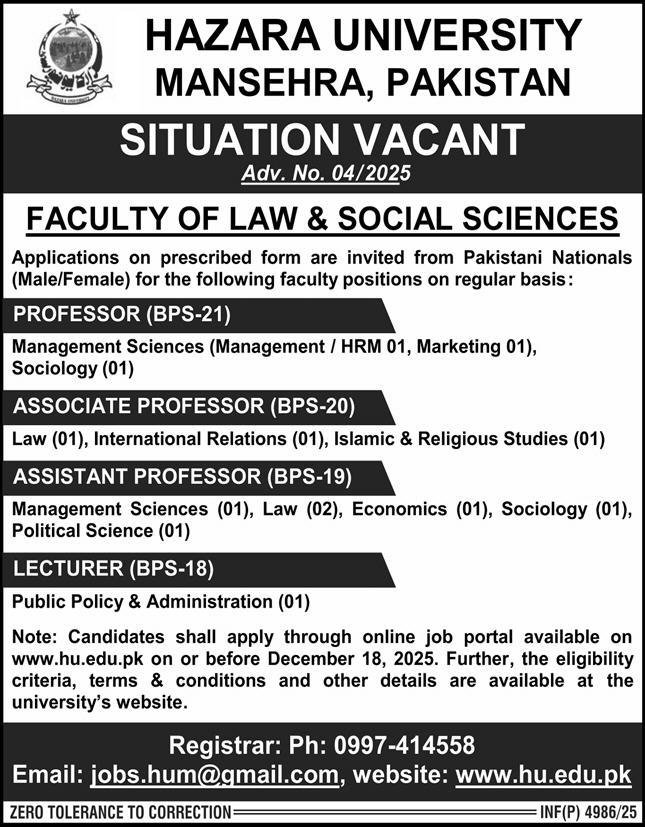 Hazara University HU Mansehra Jobs 2025 For Professors announce the Contract career opportunities for the post of See Below Ad in Khyber Pakhtunkhwa, Mansehra for the fresh and experienced candidates on Contract basis who have Check Advertisement degree. Posted date of this post is 26/11/2025 and the last date is 18/12/2025. if you are eligible for this job apply before due date.