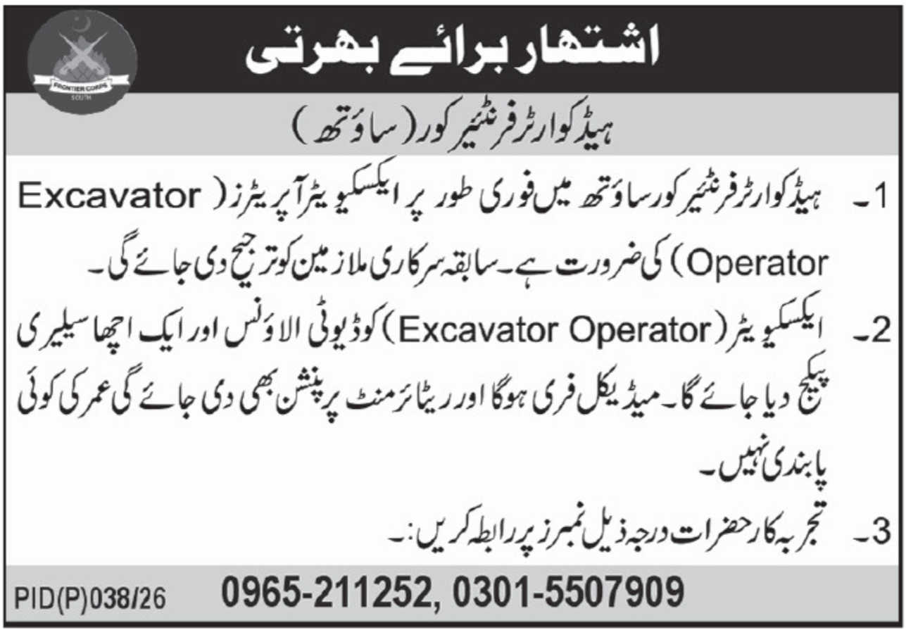 - Headquarters Frontier Corps South immediately requires Excavator Operators. Preference will be given to former government employees.