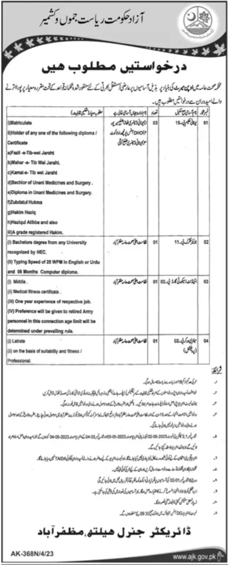 Public Health Department Muzaffarabad, muzaffarabad AJK Pakistan invites applications from eligible candidates for the post of attendant, clerk, unani hakeem, security guard and sanitary worker as per advertisement of April 11, 2023 published in daily Dunya Newspaper. Persons with Bachelor, Primary, Middle and Matric etc. education can apply.