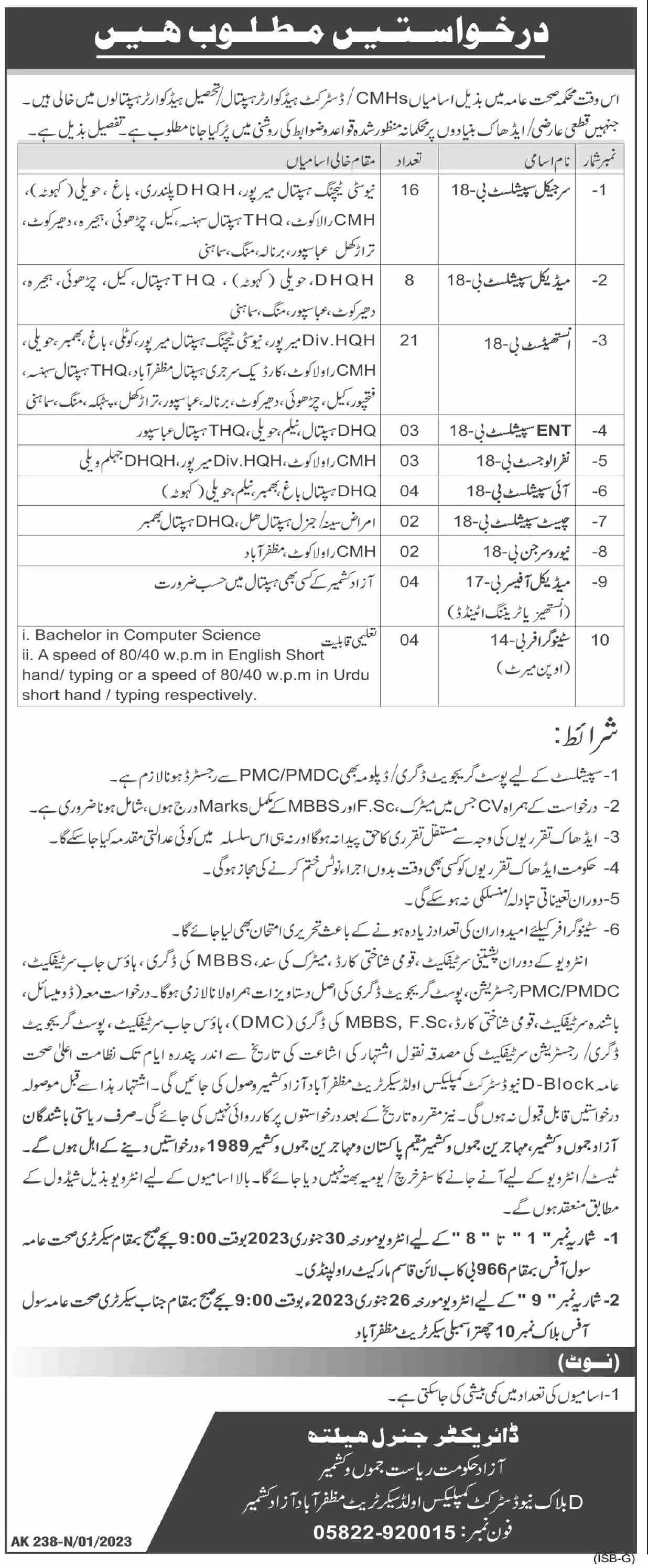 - Health Department invites applications for job positions advertised in daily Dawn dated 7 January 2023 for following vacancies in Muzaffarabad, muzaffarabad AJK Pakistan.
