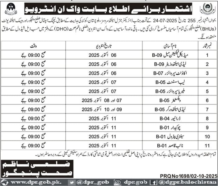 In reference to advertisement number 255 dated 24-07-2025, according to the instructions of the Director General Health Services, Balochistan, Quetta, all vacancies for Teaching Hospital District Panjgur and Basic Health Unit (BHUS) District Panjgur have been canceled. The walk-in interviews for the remaining vacancies will be held at the office of the District Health Officer (DHO) according to the following schedule.