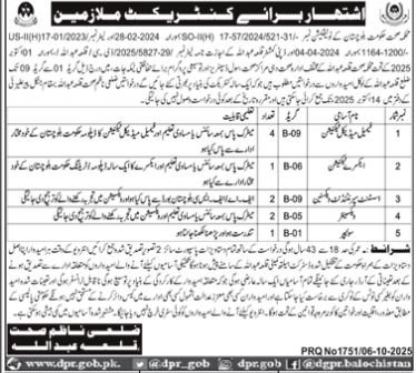 Under Government of Balochistan notification number 1164-1200/2024, application number 5827-29/2025/I.H, dated 04-04-2024 and 01-01-2025, applications are required from eligible male and female candidates from District Qilla Abdullah for the recruitment of two posts on a one-year contract basis for vaccination duty at various health centers and rural health centers. Applications can be submitted to the District Health Officer, Qilla Abdullah, until October 14, 2025. No application will be accepted after the due date.