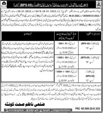 Health Department Quetta Lady Worker LHV Interview announce the Contract career opportunities for the post of See Below Ad in Balochistan, Quetta for the fresh and experienced candidates on Contract basis who have Check Advertisement degree. Posted date of this post is 30/03/2022 and the last date is 17/04/2022. if you are eligible for this job apply before due date.