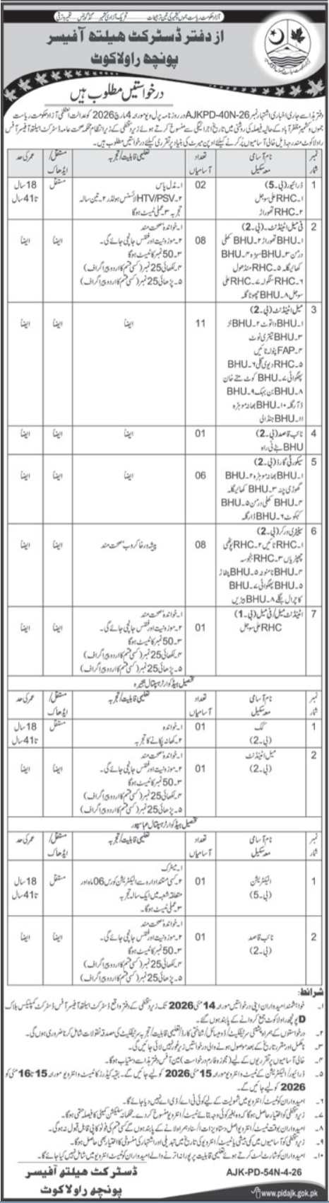 Health Department Rawalakot Jobs 2026 announce the Contract career opportunities for the post of See Below Ad in Azad Jammu Kashmir, Rawla Kot for the fresh and experienced candidates on Contract basis who have Check Advertisement degree. Posted date of this post is 29/04/2026 and the last date is 15/05/2026. if you are eligible for this job apply before due date.