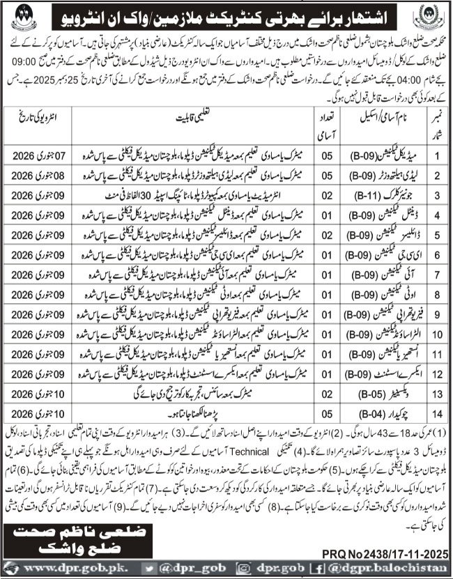 Health Department Washuk Jobs 2025 announce the Contract career opportunities for the post of See Below Ad in Balochistan, Washuk for the fresh and experienced candidates on Contract basis who have Check Advertisement degree. Posted date of this post is 18/11/2025 and the last date is 10/12/2025. if you are eligible for this job apply before due date.