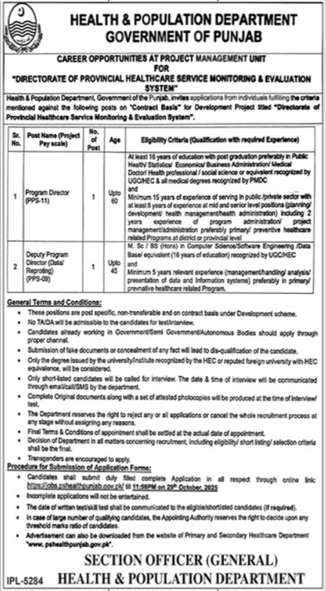 Health & Population Department, Government of the Punjab, invites applications from individuals fulfilling the criteria mentioned against the following posts on "Contract Basis" for Development Project titled "Directorate of Provincial Healthcare Service Monitoring & Evaluation System".