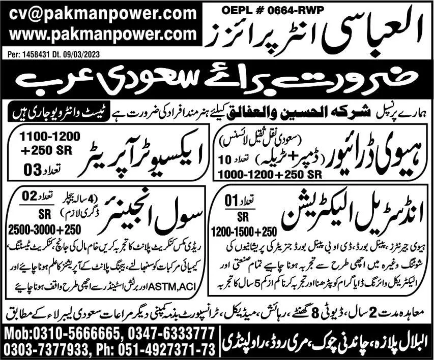 Heavy Driver & Civil Engineer Jobs in Saudi Arabia 2023 announce the Contract career opportunities for the post of See Below Ad in Saudi Arabia for the fresh and experienced candidates on Contract basis who have Check Advertisement degree. Posted date of this post is 12/03/2023 and the last date is 31/03/2023. if you are eligible for this job apply before due date.