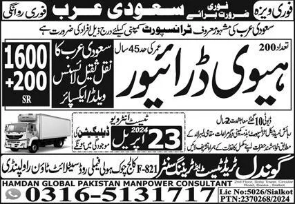 Heavy Driver Jobs in Saudia Arabia 2024 announce the Contract career opportunities for the post of See Below Ad in Saudi Arabia for the fresh and experienced candidates on Contract basis who have Check Advertisement degree. Posted date of this post is 15/04/2024 and the last date is 23/04/2024. if you are eligible for this job apply before due date.
