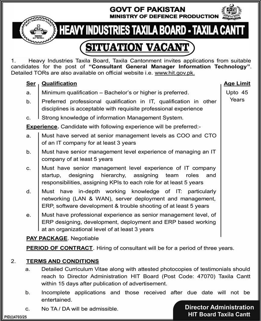 Heavy Industries Taxila boad Taxila Cantt Jobs 2025 announce the Contract career opportunities for the post of See Below Ad in Punjab for the fresh and experienced candidates on Contract basis who have Check Advertisement degree. Posted date of this post is 07/12/2025 and the last date is 22/12/2025. if you are eligible for this job apply before due date.