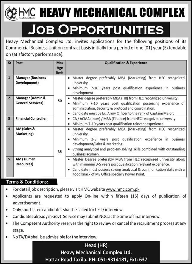 Heavy Mechanical Complex HMC Jobs 2022 announce the Contract career opportunities for the post of See Below Ad in Punjab, Rawalpindi for the fresh and experienced candidates on Contract basis who have Check Advertisement degree. Posted date of this post is 19/07/2022 and the last date is 31/07/2022. if you are eligible for this job apply before due date.