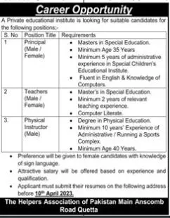 Helpers Association of Pakistan Quetta Jobs 2023 announce the Contract career opportunities for the post of See Below Ad in Balochistan, Quetta for the fresh and experienced candidates on Contract basis who have Check Advertisement degree. Posted date of this post is 01/04/2023 and the last date is 10/04/2023. if you are eligible for this job apply before due date.