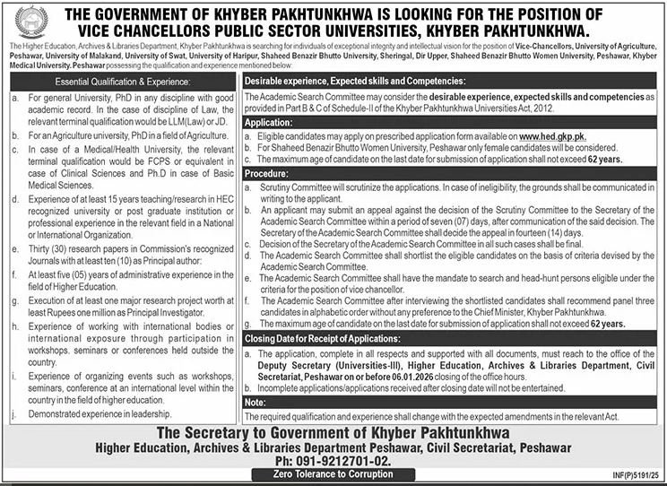 The Higher Education Archives & Libraries Department, Khyber Pakhtunkhwa is searching for individuals of exceptional integrity and intellectual vision for the position of Vice-Chancellors, University of Agriculture, Peshawar, University of Malakand, University of Swat, University of Haripur, Shaheed Benazir Bhutto University, Sheringal, Dir Upper, Shaheed Benazir Bhutto Women University, Peshawar, Khyber Medical University, Peshawar possessing the qualification and experience mentioned below: